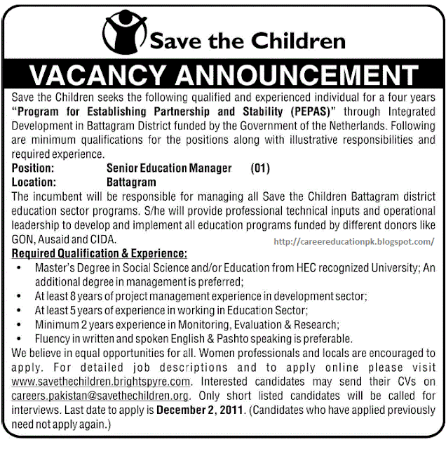 Posted: 29 Nov 2011 07:07 AM PST ![]() Detailed information and procedure for applying can be found on the above newspaper add. Visit our website for more details. Career Education PK is career builder website collecting jobs / vacancies appearing in different English News Papers of GULF (Saudi Arabia, Kuwait, UAE, Bahrain, Qatar) & Pakistan. Jobs in Pakistan, Jobs in Karachi, Jobs in Lahore, Jobs in Dubai, Jobs in Islamabad, Jobs in Rawalpindi, Jobs in Pehawar, Jobs in Faisalabad, Jobs in Multan, Jobs in Quetta, Jobs in Saudi Arabia, Jobs in Gulf, Jobs Kuwait, Oman Jobs, UK Jobs, Jang Jobs, Dawn Jobs, The News Jobs, Express Newspaper Jobs, Jobs in UAE, Motorway Police Jobs, PPSC Jobs, Army Jobs, FPSC Jobs, Dubai Jobs, Online Jobs, Government Jobs, Part Time Jobs, State Jobs, Nhs Jobs, Google Jobs, Bank Jobs, Engineering Jobs, Female Jobs, Free online jobs, Work from Home, Project Jobs, Multinational Company Jobs, Call Center Jobs, careers, career center, telecom jobs, career Pakistan, career in Pakistan, career jobs, bank career, hbl career, career opportunities, career development and University Admissions. Click here for more NGO Jobs |